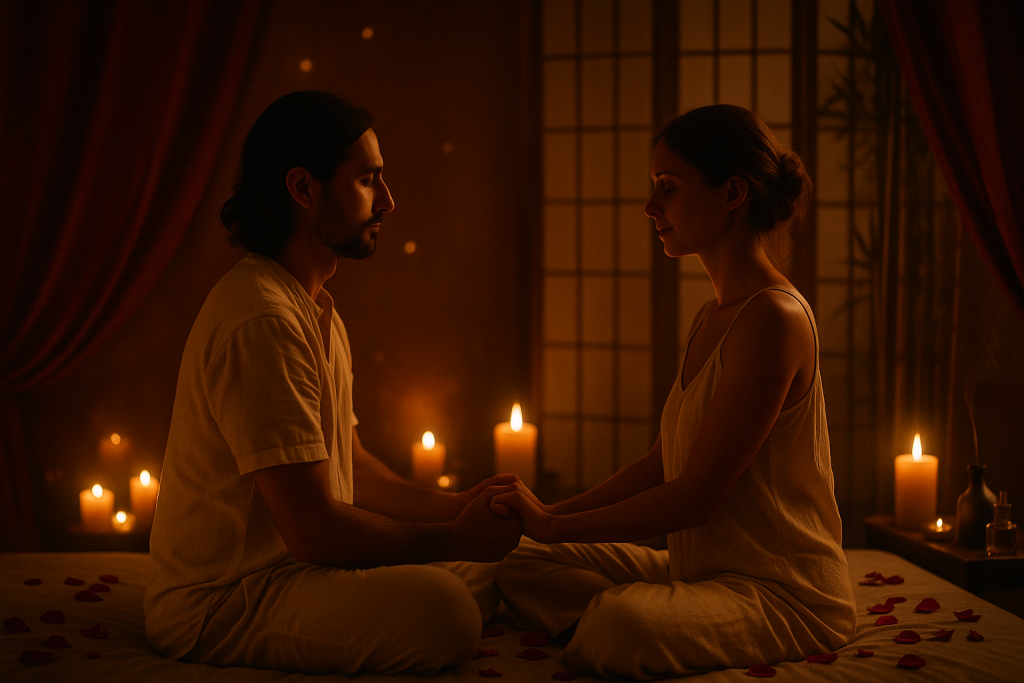 Incluye una atención especial a las zonas íntimas masculinas y femeninas, mediante el masaje de Lingam y Yoni, realizados con profundo respeto y cuidado, para potenciar el placer, la conexión y la apertura emocional.
